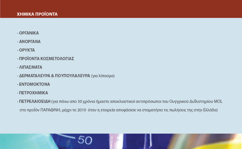 Από το 1957 έως σήμερα έχουμε αναλάβει με επιτυχία την αντιπροσώπευση πολλών Οίκων του Εξωτερικού (στις περισσότερες περιπτώσεις, κατ' αποκλειστικότητα και σε μακροχρόνια βάση) στην Ελλάδα, με ποικιλία στα αντικείμενα δραστηριοτήτων και προϊόντων. Η ενασχόλησή μας με διαφορετικούς τομείς δραστηριοτήτων και προϊόντων και η σε βάθος μελέτη τους, προκειμένου να τα προωθήσουμε με συνέπεια και επιτυχία, έχει εμπλουτίσει ακόμα περισσότερο τις γνώσεις μας γι'αυτά.